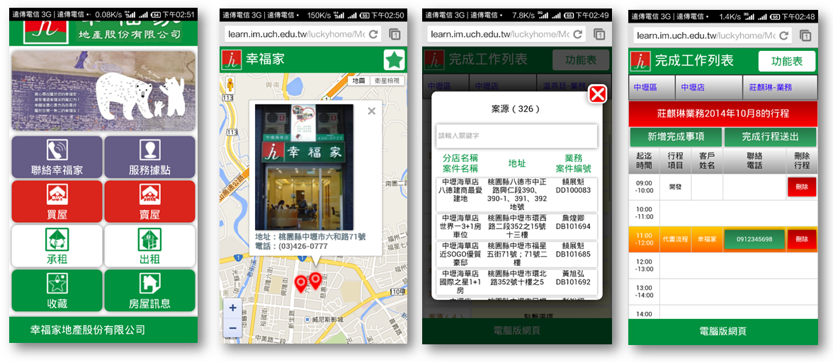 - 本案之委讬人「幸福家地产股份有限公司」,与本校合作进行专业之行动化房仲资讯系统,以提供顾客买屋、租屋、卖屋等资讯,以及提供公司内业务人员资讯管理的行动商务平台